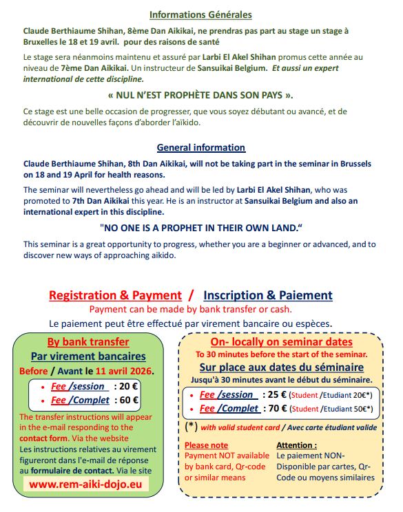 En raison de souci de santé, Claude Berthiaume Shihan ne pourra malheureusement pas prendras part au stage du mois d’avril. Nous lui adressons nos vœux de prompte convalescence.